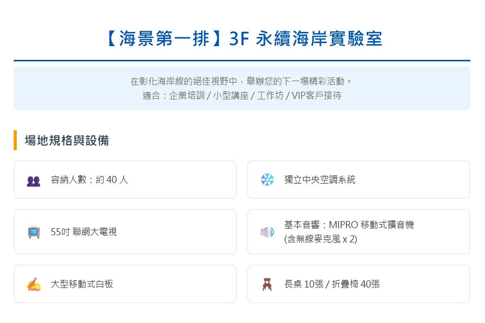 【彰化場地租借】白色海豚屋3F多功能教室/會議室 (近彰濱工業區.全興工業區.線西工業區.伸港.和美.線西/好停車)【本預約系統為登記及聯繫用途,實際費用請參考場地租借辦法】